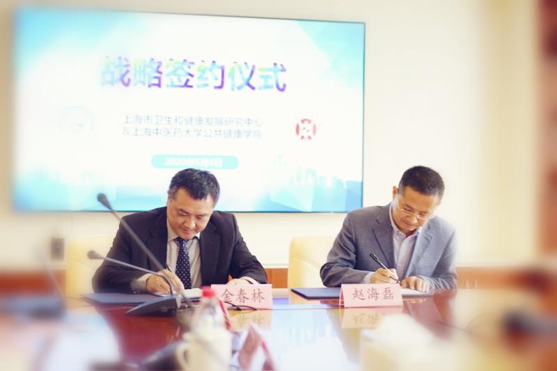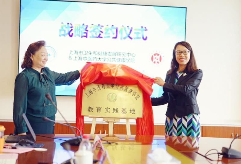 签约仪式由上海市卫生和健康发展研究中心主任金春林主持,上海市卫生和健康发展研究中心党总支书记金玲、公共健康学院党总支书记段艳霞分别致辞。双方表示,建立战略合作关系有助于发挥各自优势,在公共卫生政策研究、人才培养、社会服务等方面相互促进。在观看上海市卫生和健康发展研究中心十年发展宣传片后,金春林主任和赵海磊院长分别介绍中心及公共健康学院概况,进一步增进相互了解。随后双方签订了战略合作协议并为上海中医药大学公共健康学院教育实践基地揭牌。