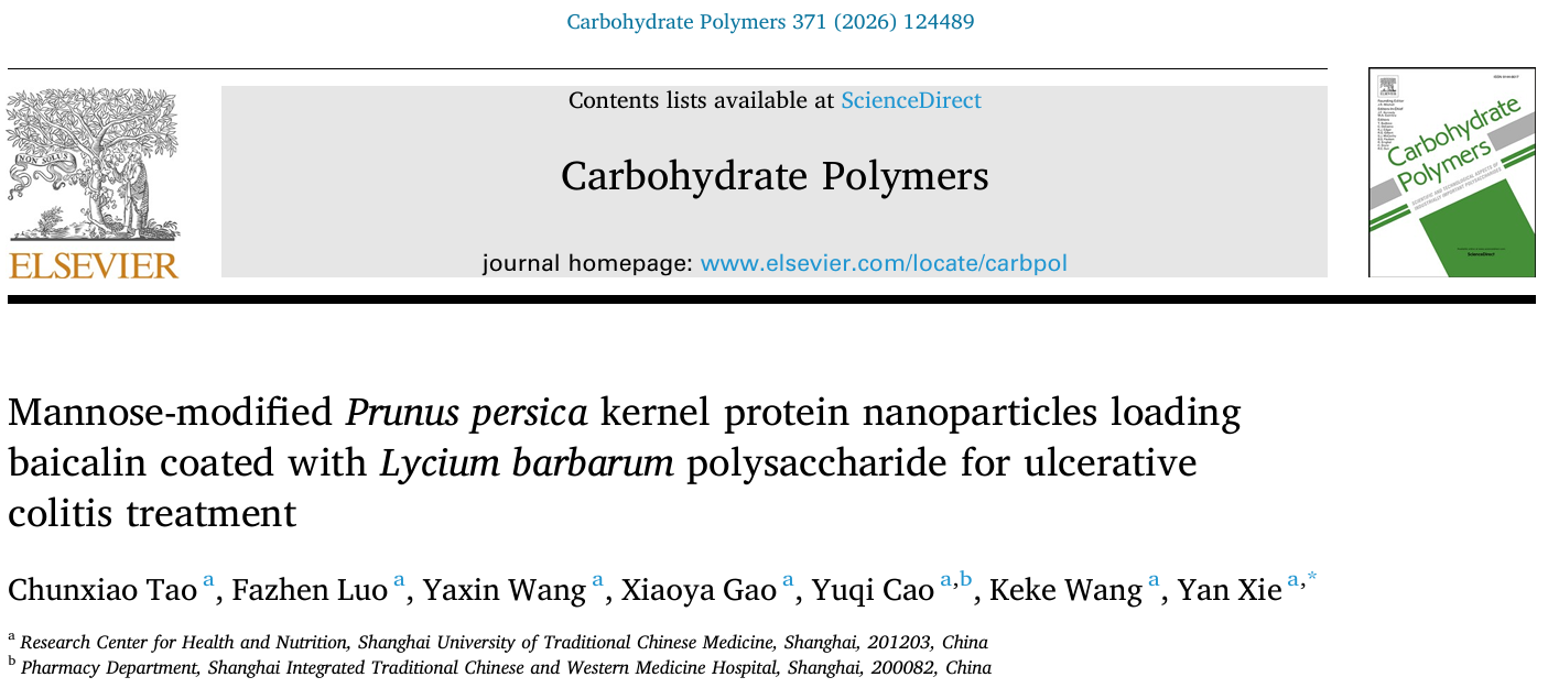 近日,我院健康营养研究室谢燕团队在应用化学一区TOP期刊Carbohydrate Polymers发表题为“Mannose-modified Prunus persica kernel protein nanoparticles loading baicalin coated with Lycium barbarum polysaccharide for ulcerative colitis treatment”的研究成果,该研究成功构建了负载黄芩苷的甘露糖修饰桃仁蛋白/枸杞多糖纳米粒缓解溃疡性结肠炎,为天然来源载体用于疾病治疗提供新策略。