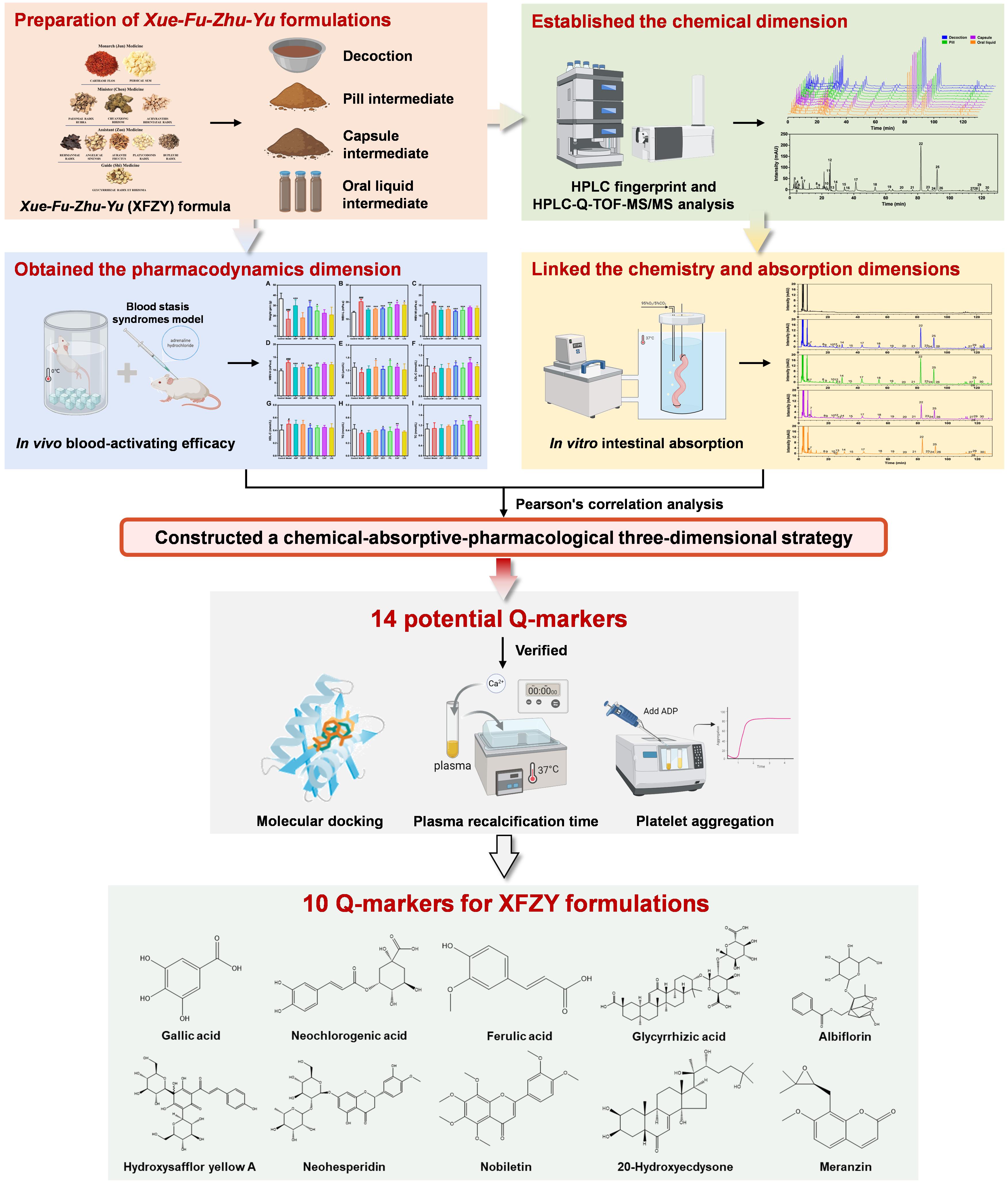 近日,我院健康营养研究室谢燕团队在Journal of Ethnopharmacology(Q1 TOP 5)发表题为“A multidimensional strategy for exploring quality markers of Xue-Fu-Zhu-Yu decoction and its three processed products based on intestinal absorption and pharmacodynamics”的研究成果,该研究将化学分析、肠吸收和药效学三个维度相关联,探索血府逐瘀制剂的质量标志物,为丰富和完善经典复方的质量控制提供科学基础。