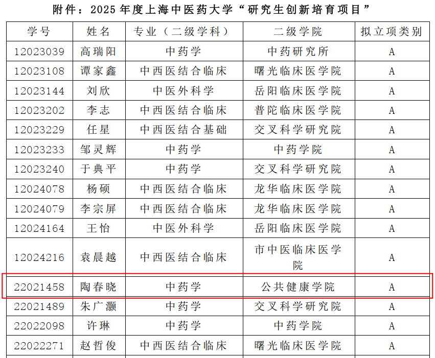 近日,2025年度上海中医药大学研究生创新培育项目立项结果正式公布。经过个人申请、学院推荐、学校专家组严格评审,我院2023级博士研究生陶春晓同学(导师:健康营养研究室 谢燕研究员)申报的项目《桃仁蛋白肠内自组装胶束的形成原理及其跨膜转运机制初探》脱颖而出,成功获批A类资助。